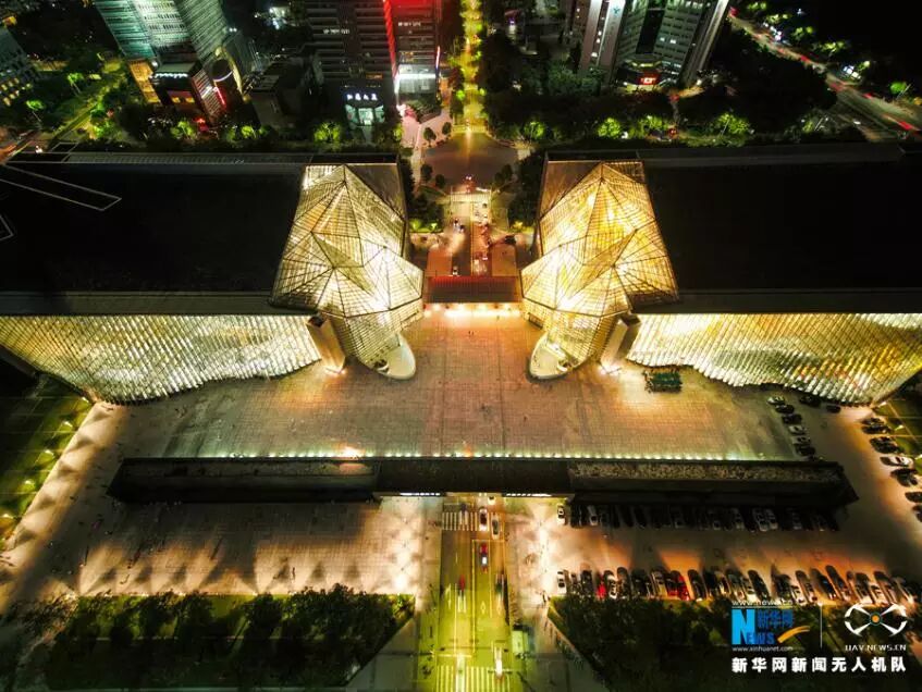 无人机航拍深圳音乐厅和图书馆的夜景。新华网发(梁必成 摄)