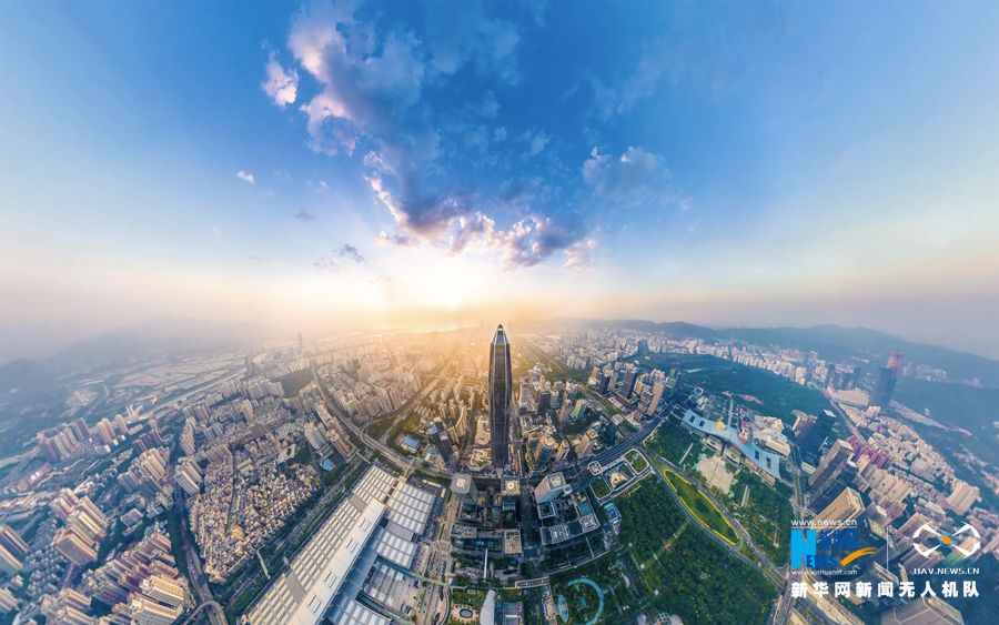 航拍高耸入云的平安金融中心,它与繁华的福田中心区相得益彰。新华网发(刘东林 摄)