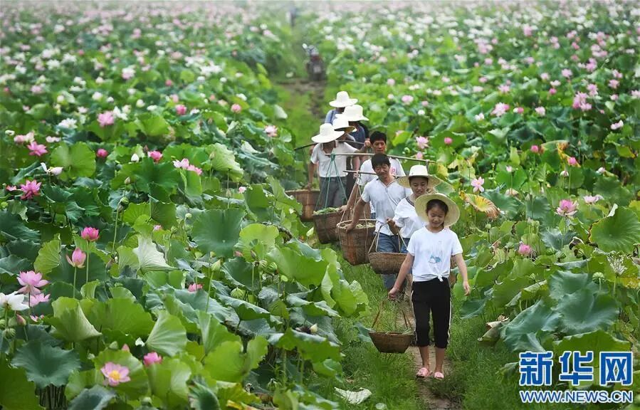 在江西省广昌县甘竹镇甘竹村,莲农从丰收的莲田间走过。新华社记者 万象 摄