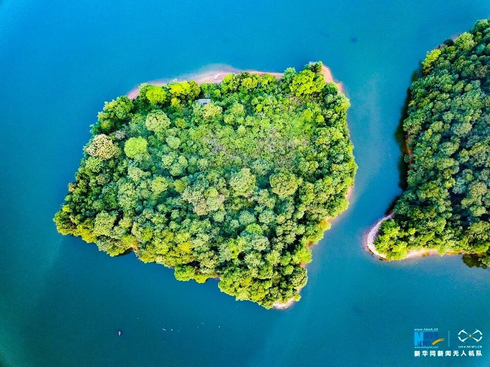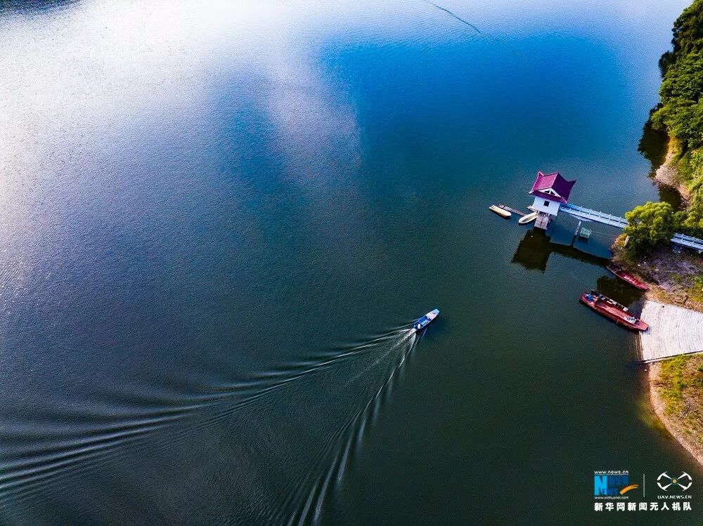 航拍江西宜丰夏日渊明湖畔掠影。新华网 杨益民 飞手:赵浩旭 摄