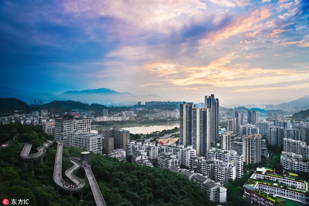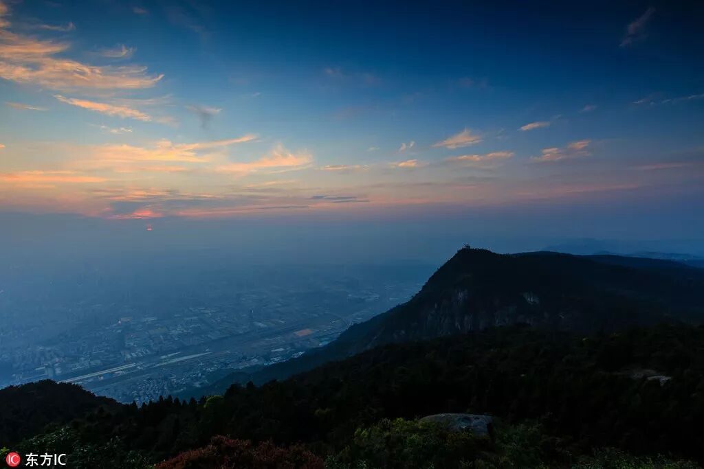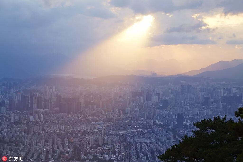 日落时分,福州市区和周边的山,右侧山顶为通讯基站