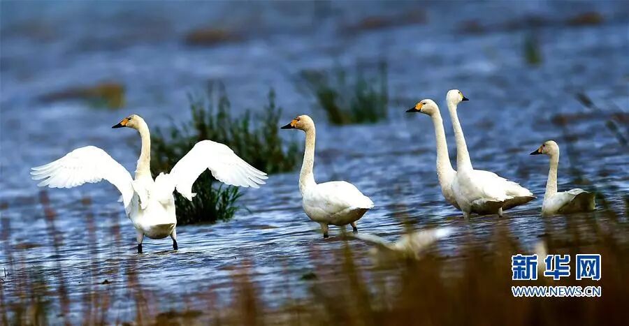 一群小天鹅在闽江口湿地觅食、嬉戏。新华社记者 梅永存 摄
