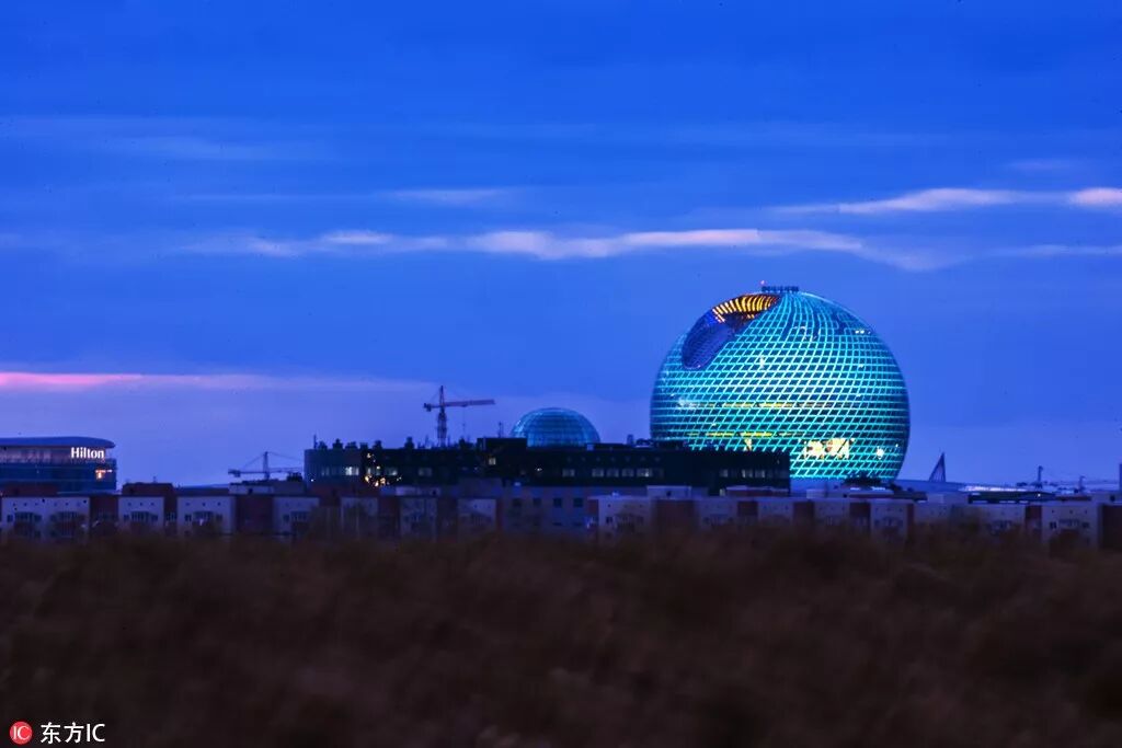 哈萨克斯坦阿斯塔纳世博会主场馆梦幻夜景,当今世界最大玻璃球形建筑。