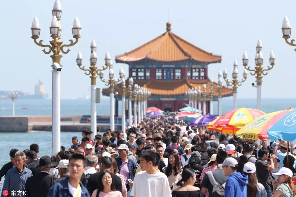 游人在中国青岛栈桥风景区游玩。
