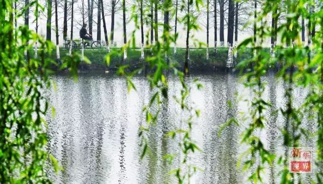 在安徽省肥西县,一位备耕的农民行驶在杨柳吐绿的周桥新村水塘埂上。新华社记者 陶明 摄