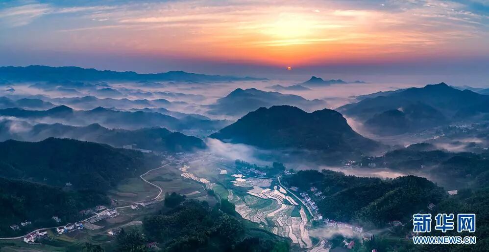 安徽省霍山县诸佛庵镇西石门村在朝阳的映照下宛如人间仙境(无人机拍摄)。新华网发 (徐程 摄)