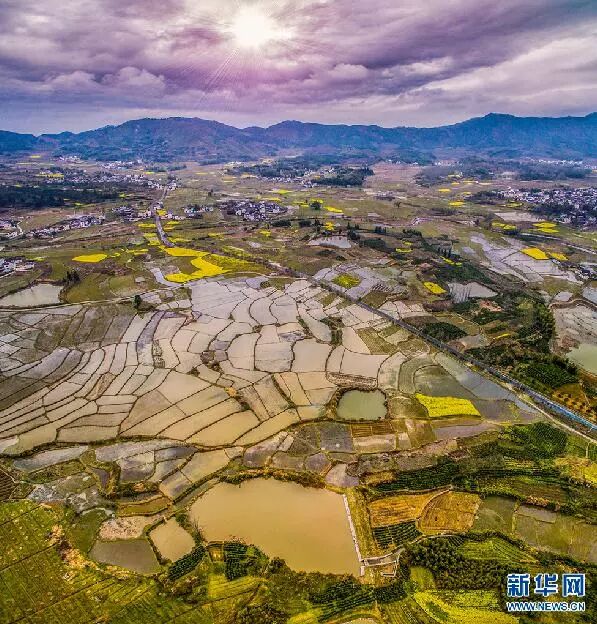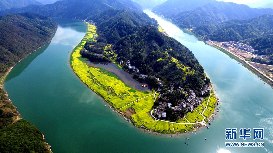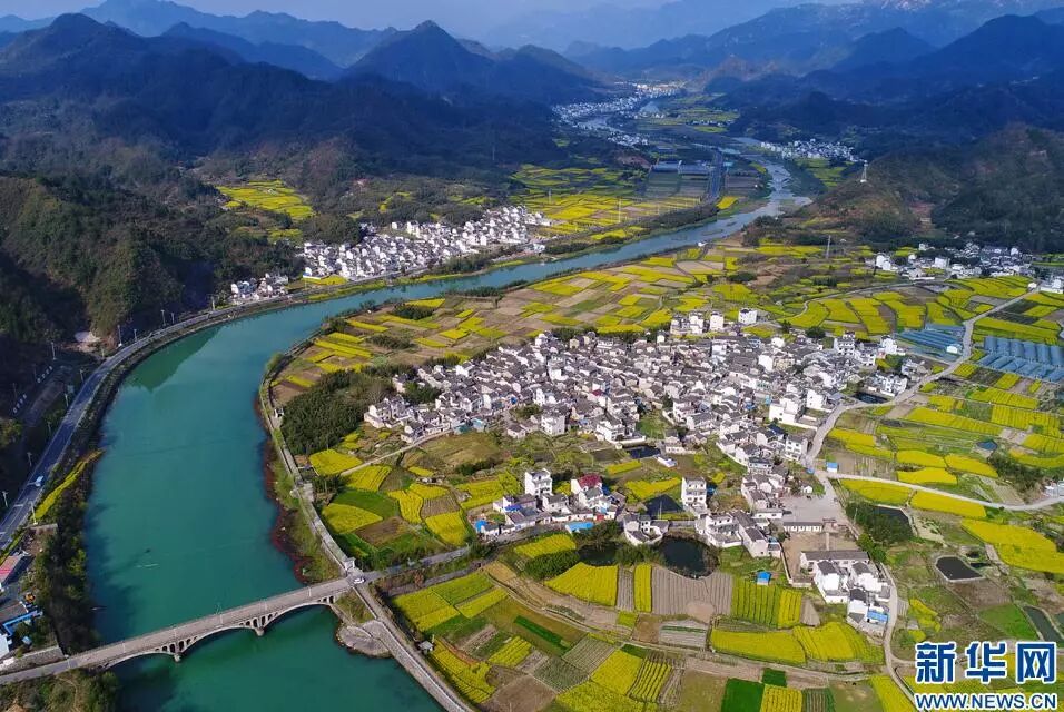 有山水画廊之称的安徽省歙县新安江两岸,乡村处处开放的油菜花与远山近水、古民居交相辉映,如诗如画。新华网发(潘成摄)