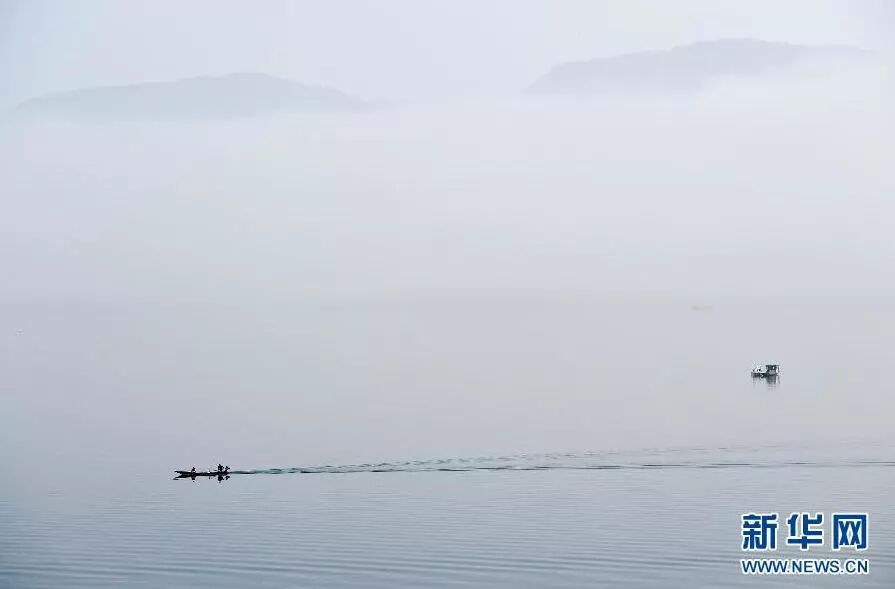 渔船在晨雾中的太平湖行驶。新华社记者 张端 摄