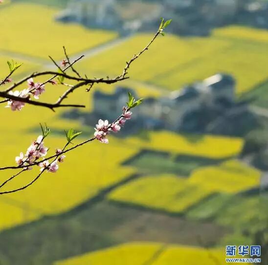 在黟县柯村的高处,穿过一枝桃花俯拍油菜花田。新华网发 应作平 摄