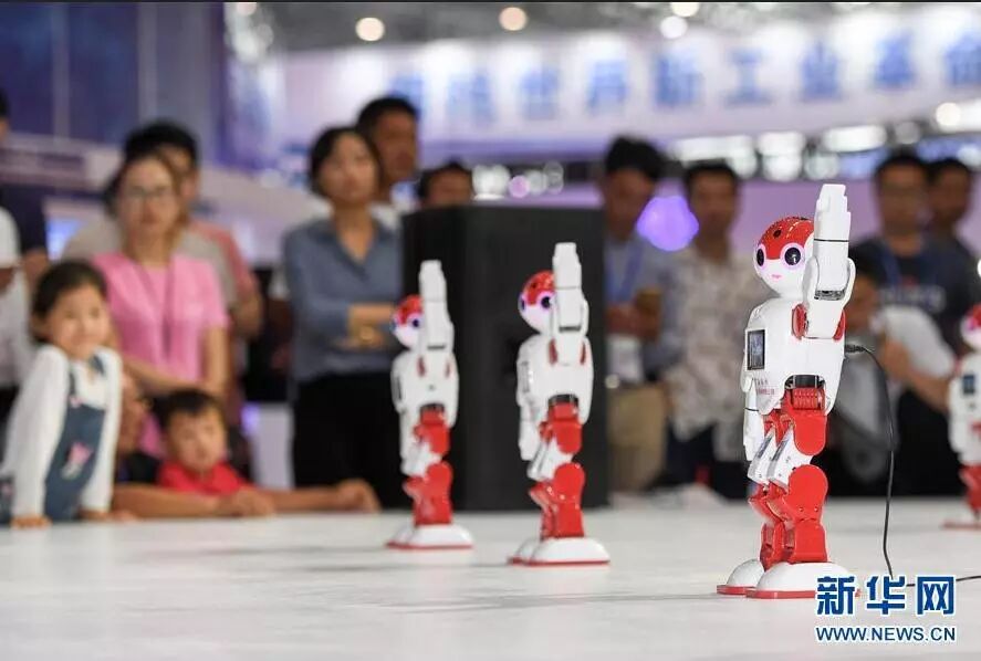 5月25日,智能机器人在2018世界制造业大会上为观众表演舞蹈。新华社记者 张端 摄