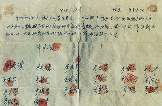 小岗村18位农民按下红手印的“包产到户”契约(资料照片)。 新华社发