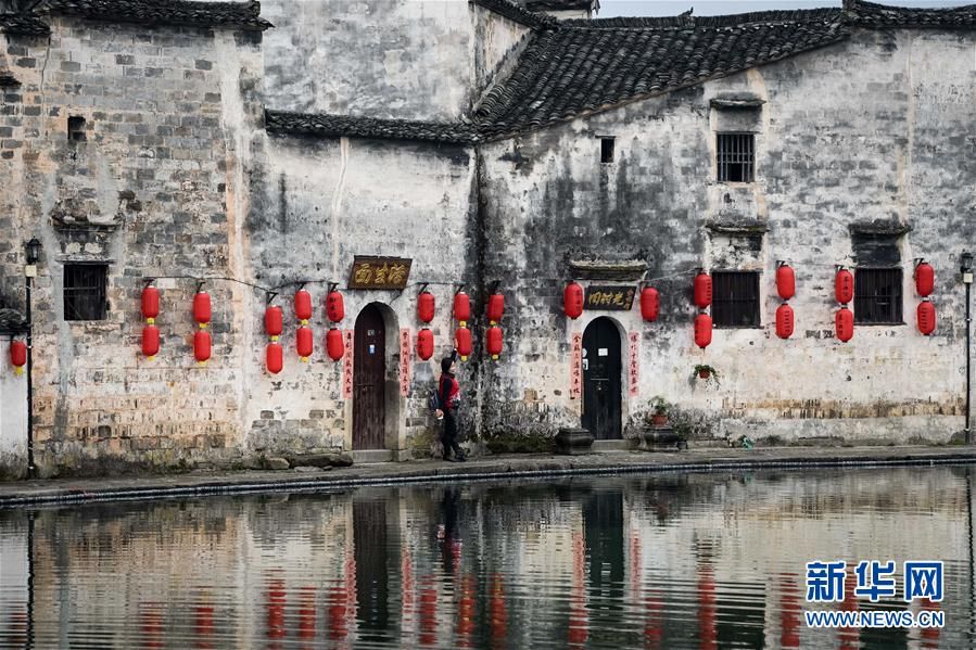 游客在安徽黟县宏村风景区月沼景点留影。新华社记者张端 摄
