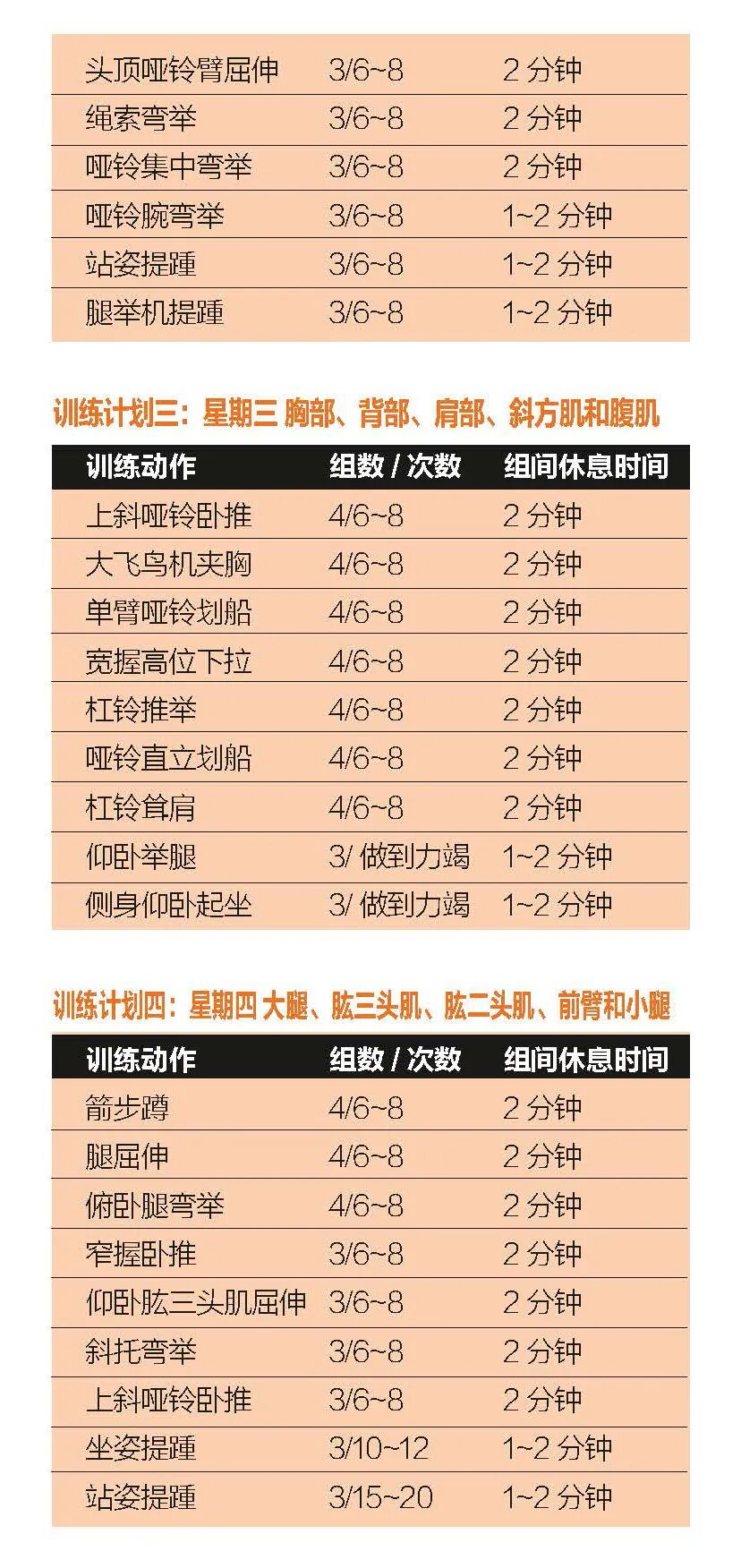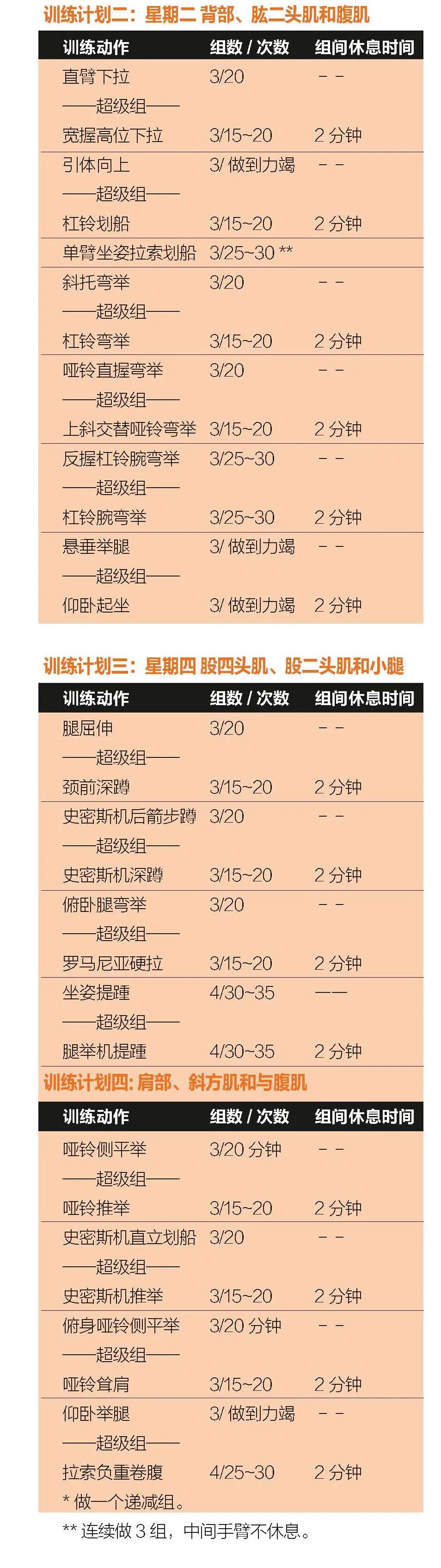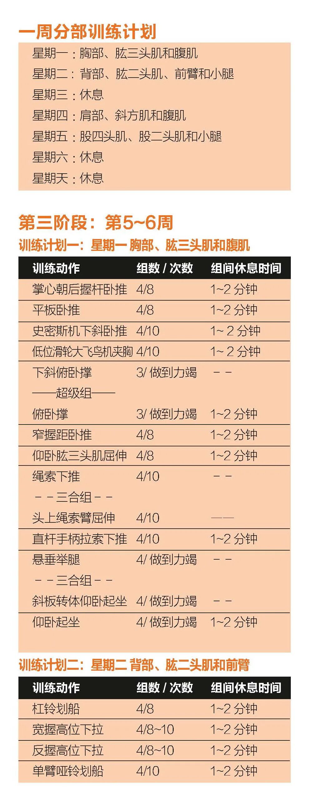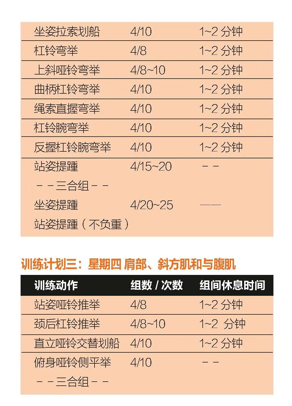 *三合组训练法则:把针对同一个部位的3个训练动作联合在一起做,中间不休息。