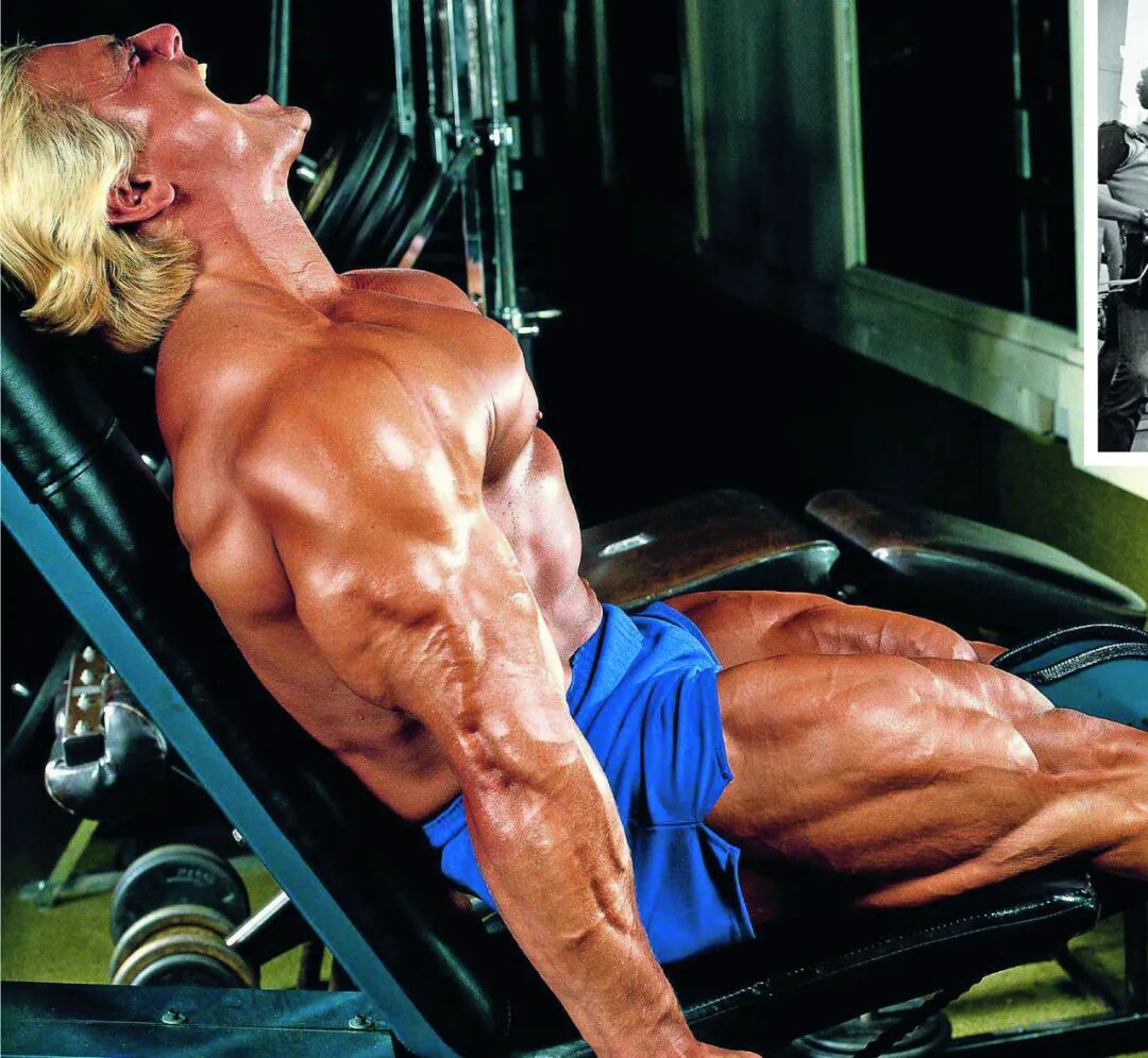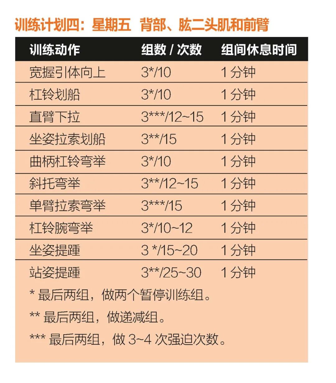 * 在采用退让次数训练法则做完一组之后,紧接着采用只能做3~5 次的重量,做3 个常规训练组。对于这个部位的其他训练动作,全都采用常规模式训练。