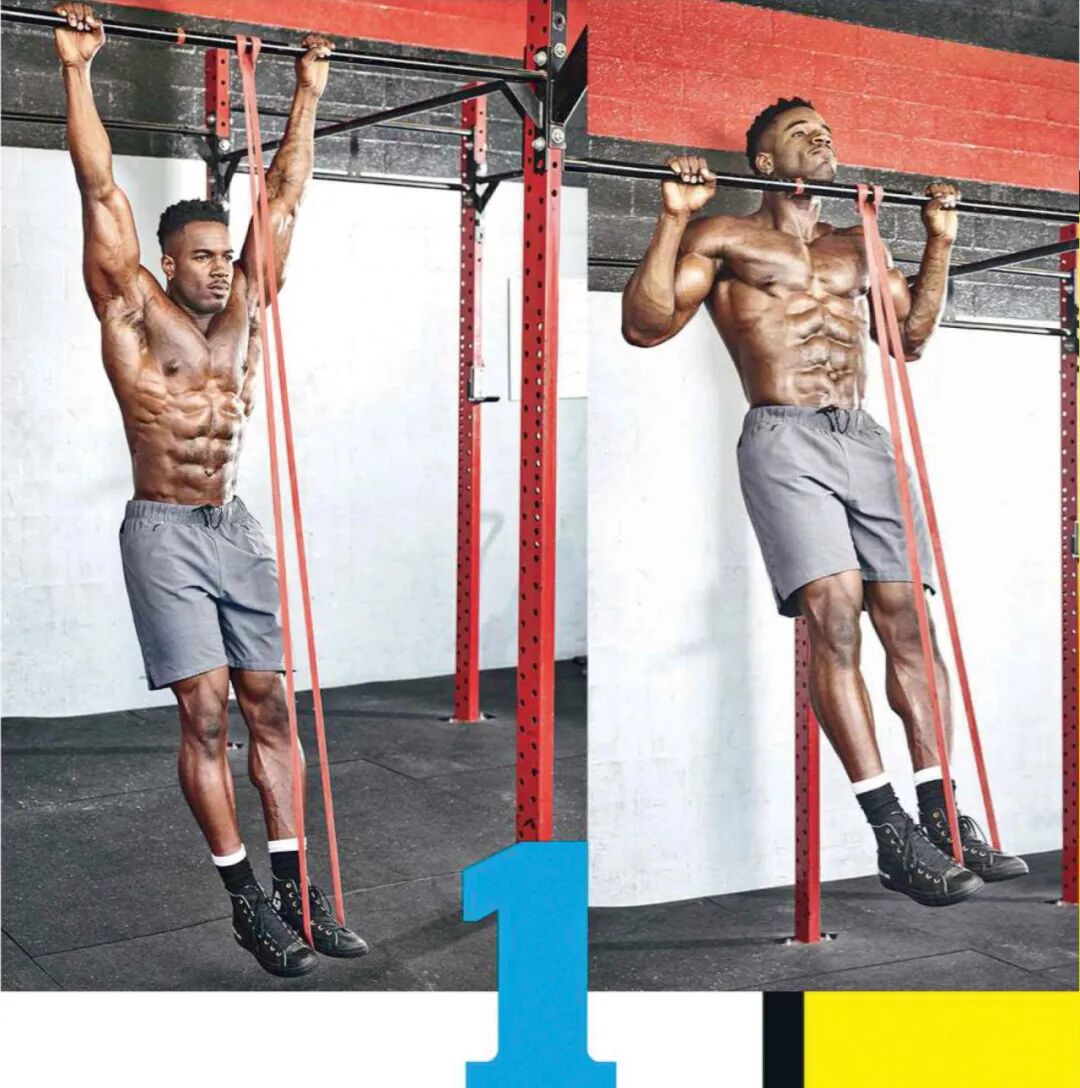 具体做法:将一条宽的弹力带固定在引体向上的杆子上,让它自然下垂。选择一条适合你力量水平的弹力带,弹力带越粗,提供的助力就越大。将一只脚或膝盖放在弹力带底部的环中,然后用与肩同宽的握距抓住引体向上的杆子。降低身体到手臂完全伸直,然后把自己拉到下巴超过杆子的位置。重复做。当你变得更强壮时,可以使用更细的弹力带,并最终达到能以高次数(10次以上)进行自体重引体向上。
