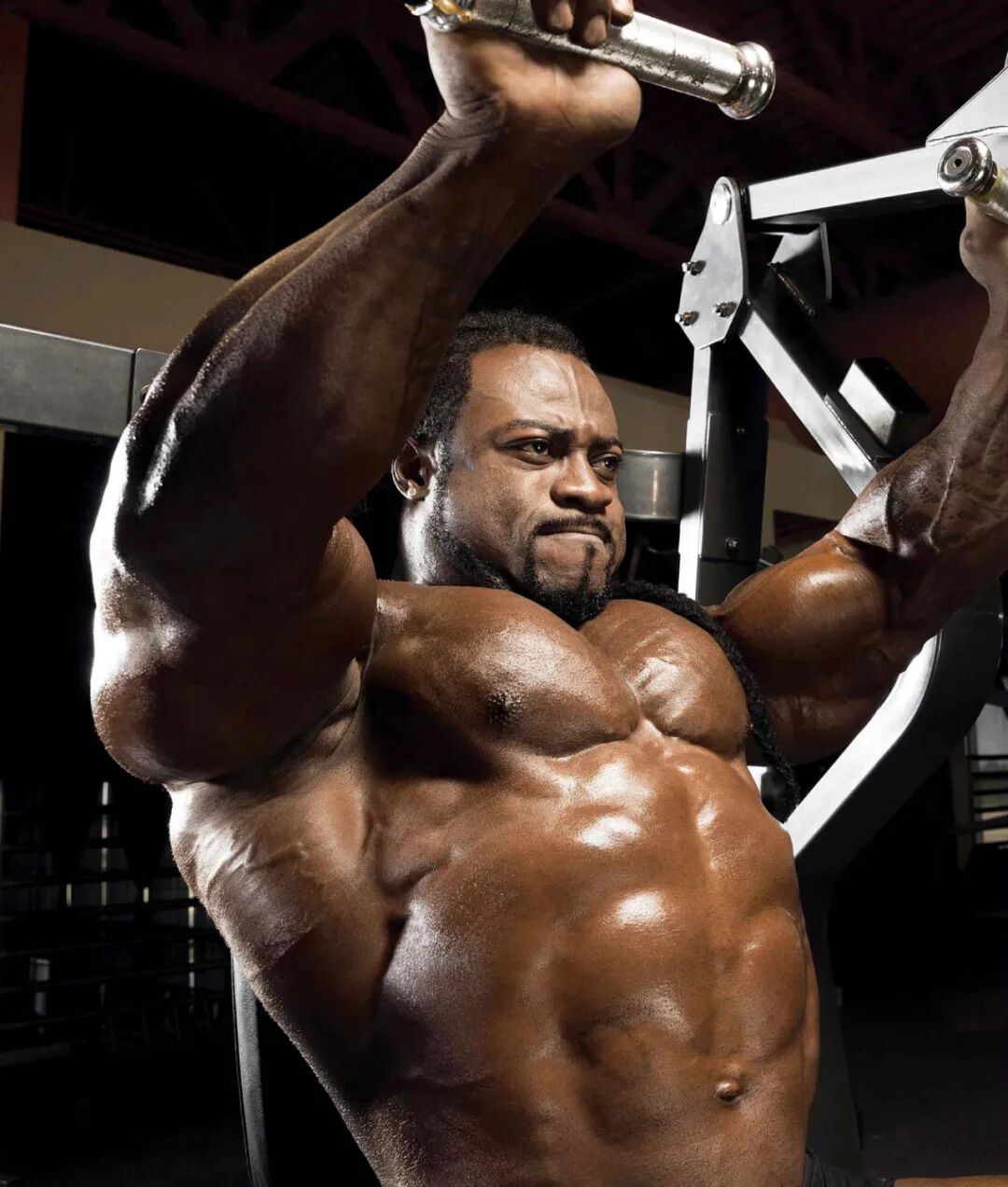 对于胸部训练的第一个复合训练动作,博纳克要么做上斜杠铃卧推,要么做上斜哑铃卧推。“用杠铃做上斜卧推时,我最后一组的负重量通常会达到330磅。”博纳克说,“如果用哑铃做的话,负重量会达到132磅,做到力竭为止,因为我所在的健身房里没有更大重量的哑铃。”