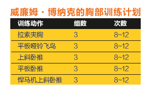 威廉姆·博纳克一直专注于保持自己强大的胸部优势,他每个星期二都会用教练尼尔·黑尔独创的Y3T训练模式练一次胸。
