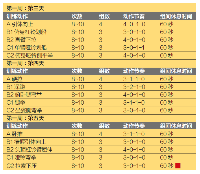 说明:训练计划中给出的每组重复次数仅仅是第一周的要求,在第2周时,每组做10~12次;第3周时,每组做6~8次,第4周,每组做12~15次。你应该根据每一周的每组目标重复次数相应地增加或者降低训练时的负重量。