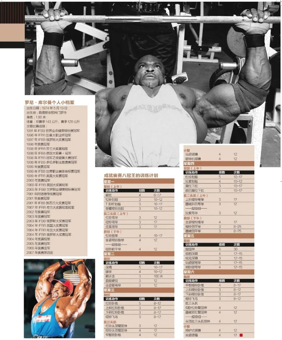 罗尼的训练方式更接近于老一辈的健美运动员。他每周每个部位练两次,而且经常每天进行两次力量训练。罗尼还更喜欢用杠铃和哑铃做基本训练动作。比如,罗尼典型的胸部训练动作几乎都是卧推类动作——平板卧推、上斜卧推和下斜卧推。他一次训练时用杠铃做卧推,下次训练时用哑铃做卧推,交替进行。