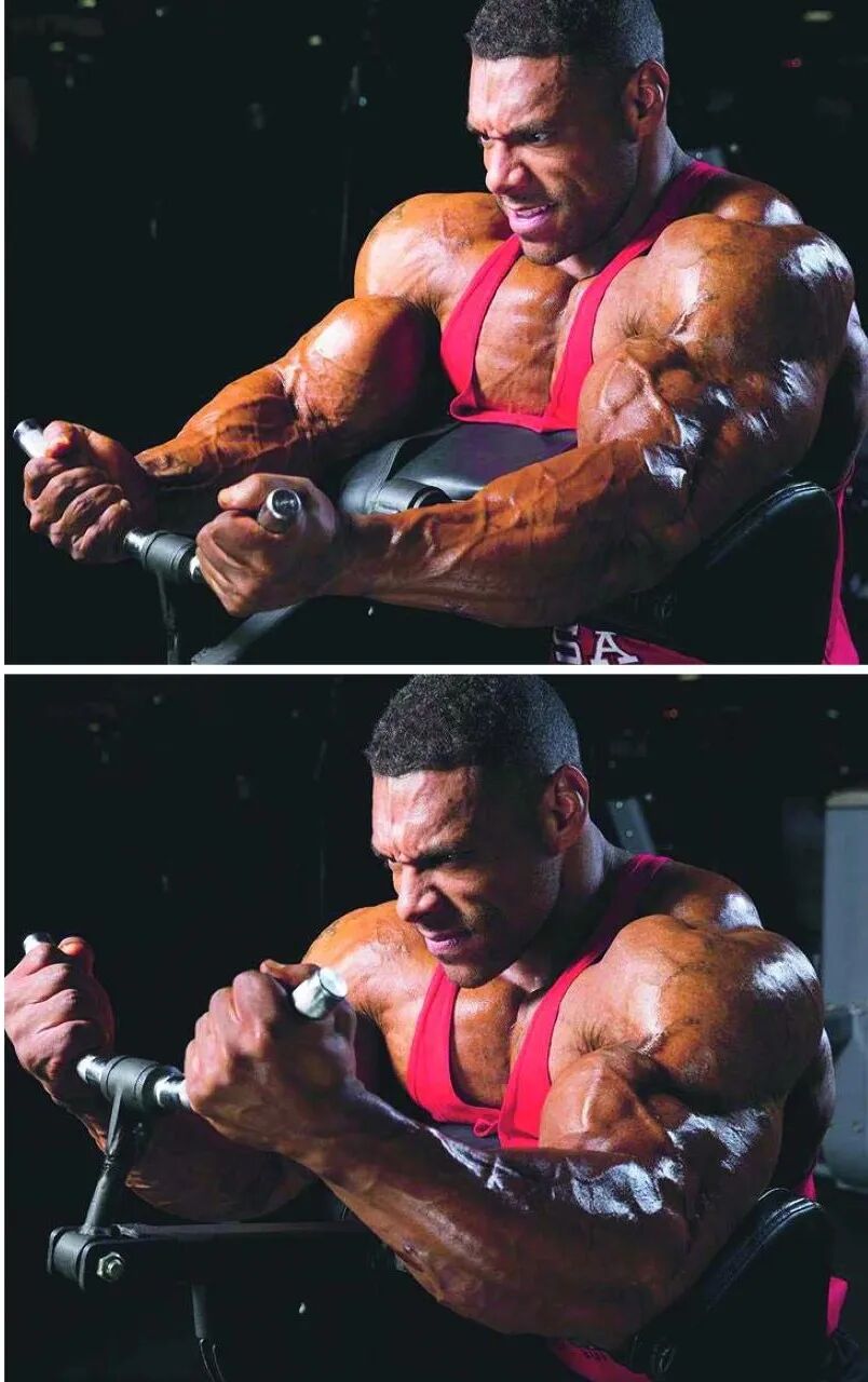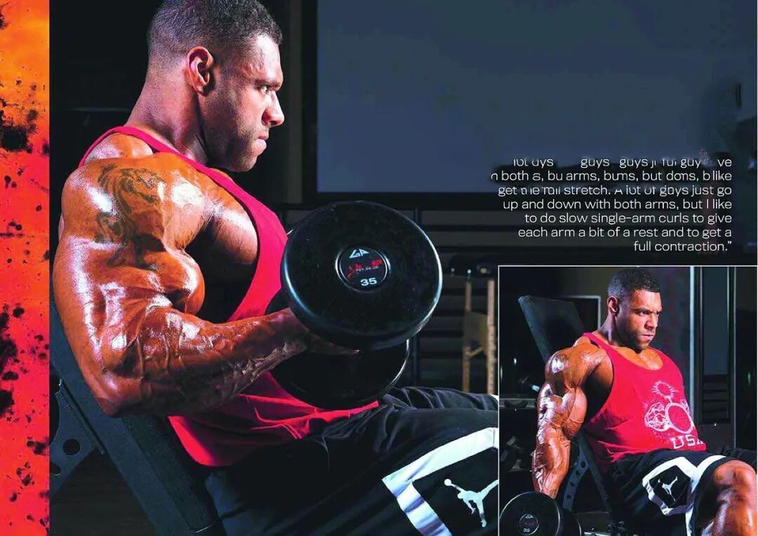“我喜欢对着镜子做这个动作,这样我就能更直观的看着肱肌伸展和收缩。很多人做这个动作时,喜欢把哑铃保持在身体两侧上下运动,但我发现,把哑铃弯举到胸部前方,并且在动作的最高点时,把手腕向前移,可以更有效地刺激肱肌。”■