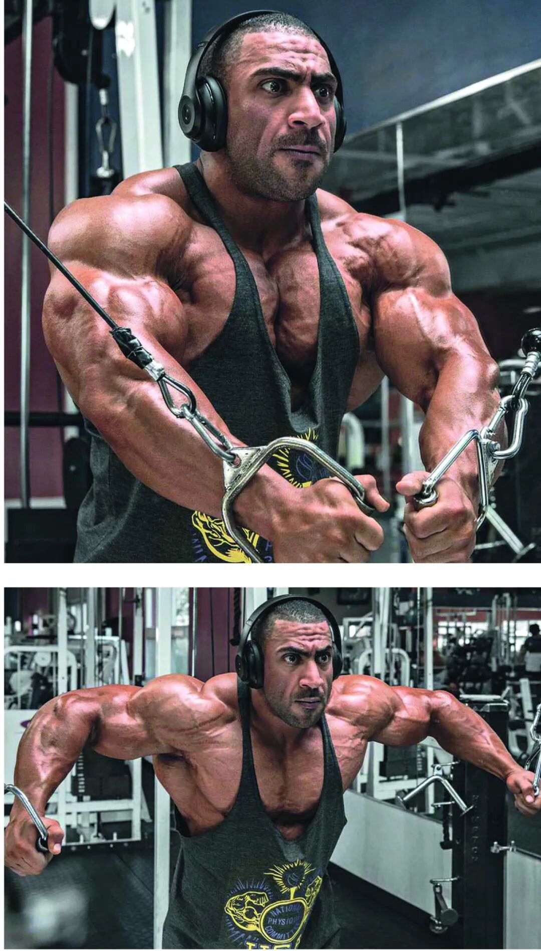 很多健美运动员喜欢把两个功能相反的对抗肌群放在一起练,如肱二头肌和肱三头肌、股四头肌和股二头肌、胸大肌和背阔肌。此时,可以做完练一个部位的训练动作之后,不休息,立即做练对抗肌群的训练动作。阿诺德·施瓦辛格就经常把胸部和背部放在一起练,把胸部训练动作和背部训练动作联合在一起做超级组。这样做的好处是,当一个肌群在训练时,对抗肌群处于休息状态,而且得到了很好的拉伸。这样不仅能提高训练强度,还能节省训练时间,提高训练效率,促进肌肉更好的充血。