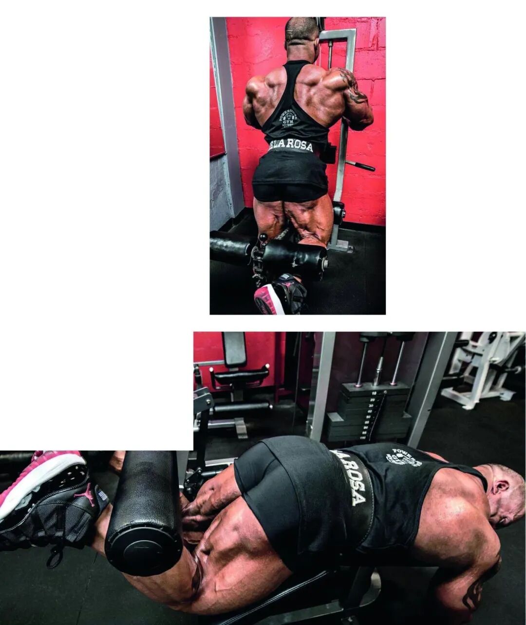 “做任何股二头肌训练动作时,你都应该确保在动作的最高点时,对股二头肌进行强烈的顶峰收缩。但很多人往往只做半程的腿弯举动作,那样很难充分地刺激股二头肌。做这个动作时,你应该像做肱二头肌弯举时那样,一直把脚后跟上升到最高的位置。在每次动作的最高点时,脚后跟都要尽可能地贴近后背。做前两组动作时,我会在动作的最高点时暂停片刻,对股二头肌进行强烈的顶峰收缩。此后,我会增加负重量,每组都练到力竭。在负重量很大的时候,应该避免在动作的最高点时停留太长时间,因为那样容易拉伤肌肉。”
