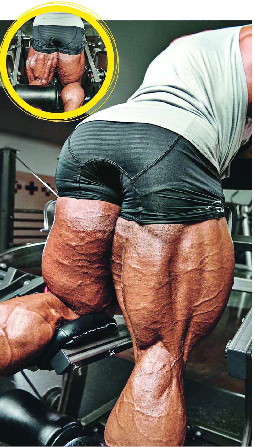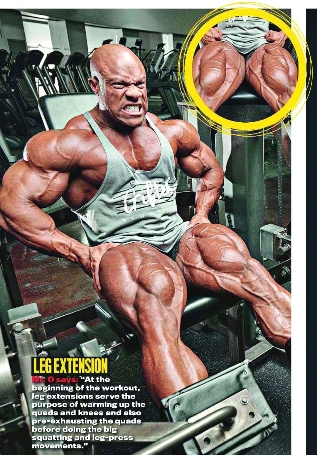 希斯:“在腿部训练的后半段做这个动作时,由于股四头肌已经被充分预热了,所以,我的目的是使股四头肌受到更进一步的刺激。两个腿分别做腿屈伸,更有利于促进两侧股四头肌的平衡发展。”