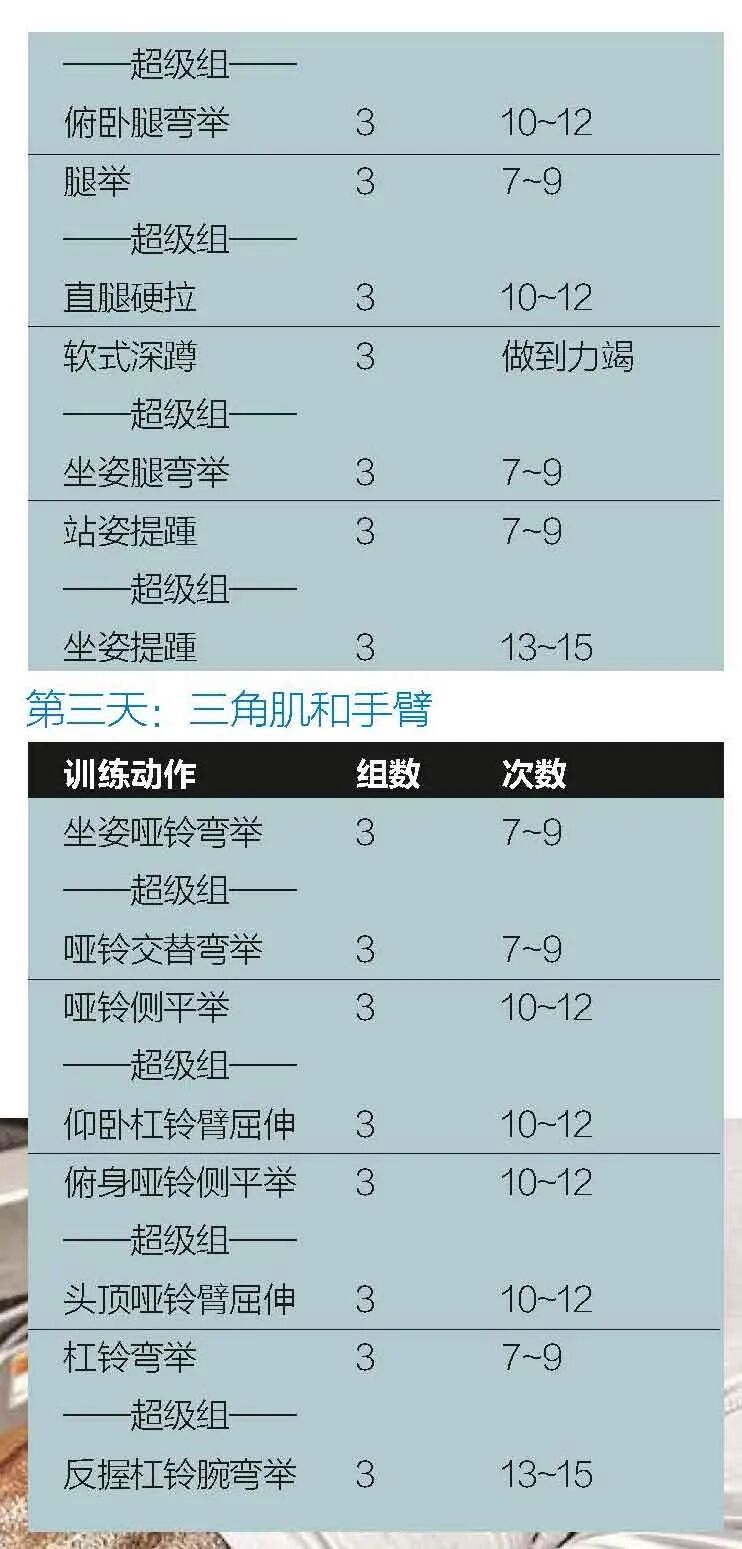 因为节假日期间能用于训练的时间往往很有限,你可以采用每周只练3天的分部训练计划,把全身各部位分成3个部分,分别在星期一、星期三和星期五训练,也可以每一天把全身各部位都练一遍。