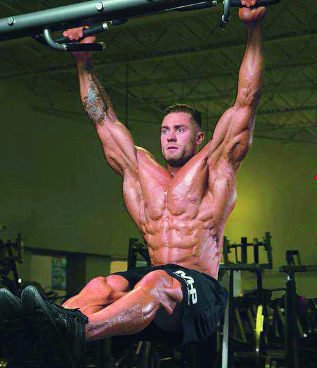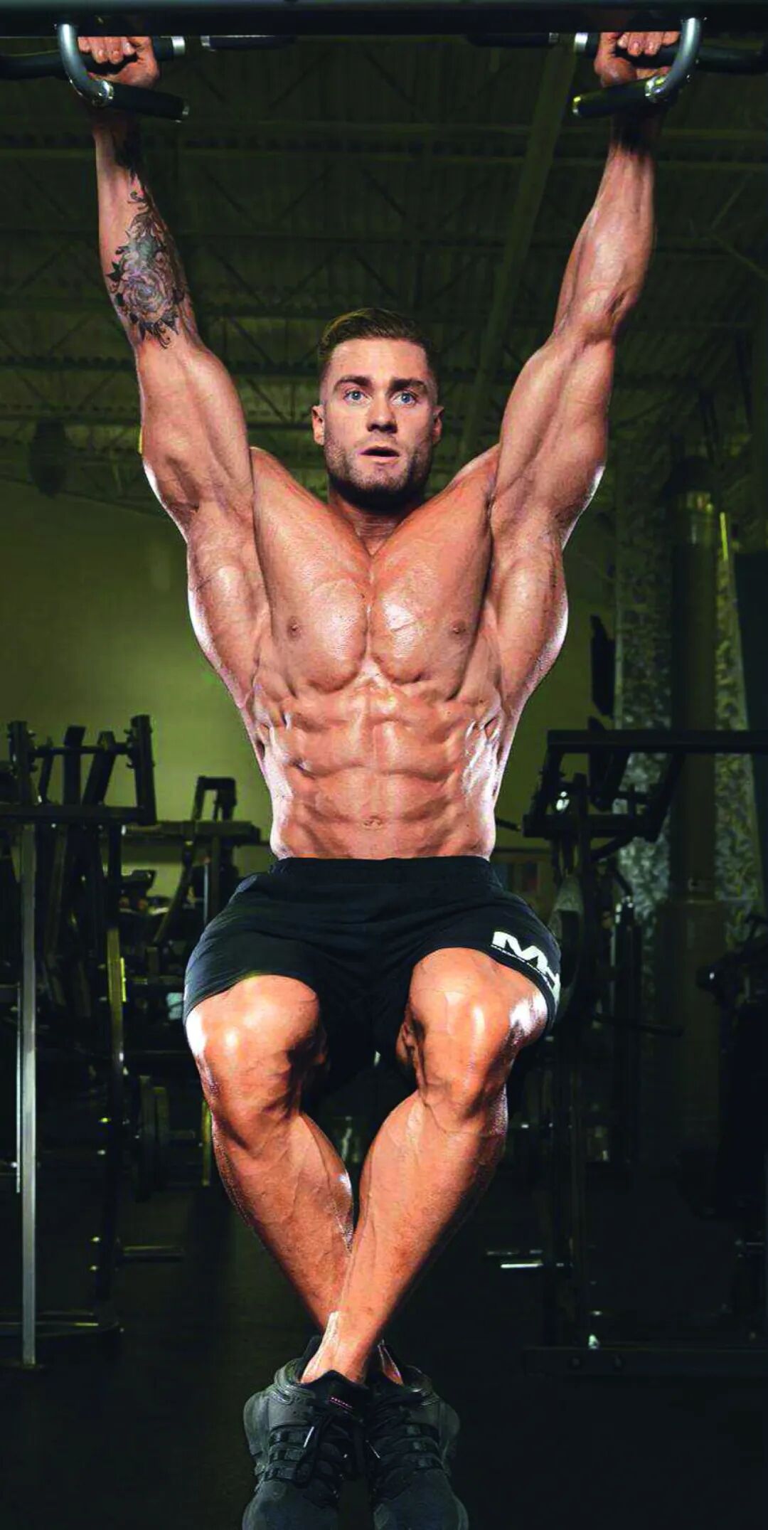克里斯的提示:“我通常用悬垂提膝动作来使腹部肌群体会到烧灼感,所以,做这个动作时,我不会对动作规范要求得非常苛刻,而只是确保腹部肌群全程持续处于紧张状态。”