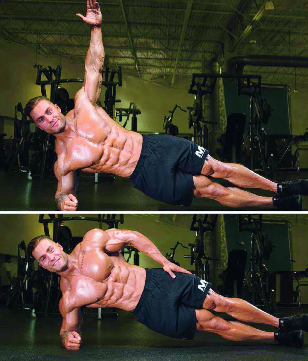 克里斯在训练中主要坚持做标准的平板支撑动作(身体朝向地面),但将侧身平板支撑动作纳入你的训练计划是刺激核心肌群的一个好方法。与标准的平板支撑动作一样,侧身平板支撑需要保持相同的紧绷身体姿势,只是要把身体朝向一侧,只用一只手支撑在地板上。身体两侧重复同样的支撑时间。伸手侧身平板支撑动作也很简单,保持侧身平板支撑的姿势,同时将上臂从身前向上抬起,在空中伸直,放在与地板垂直的位置。在保持控制的情况下缓慢地进行伸手动作,对动作的要求可以是坚持时间上的(30~60秒),也可以是重复次数上的(即每侧10~15次)。