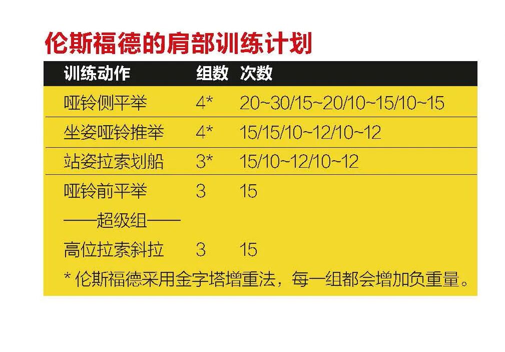 “肩部肌群越发达,特别是三角肌的中束和后束越发达,你的肩膀看起来就会越宽,块头就会显得越大。”伦斯福德说,“这样对增加比赛中的竞争力是非常重要的。三角肌训练的另一个关键因素是确保从不同角度全方位刺激三角肌,这样练出来的三角肌才会饱满、圆润而且匀称。而且,只有不同角度全方位刺激,才能确保三角肌上的线条和肌肉纹理更清晰,使你的三角肌显得更发达。”