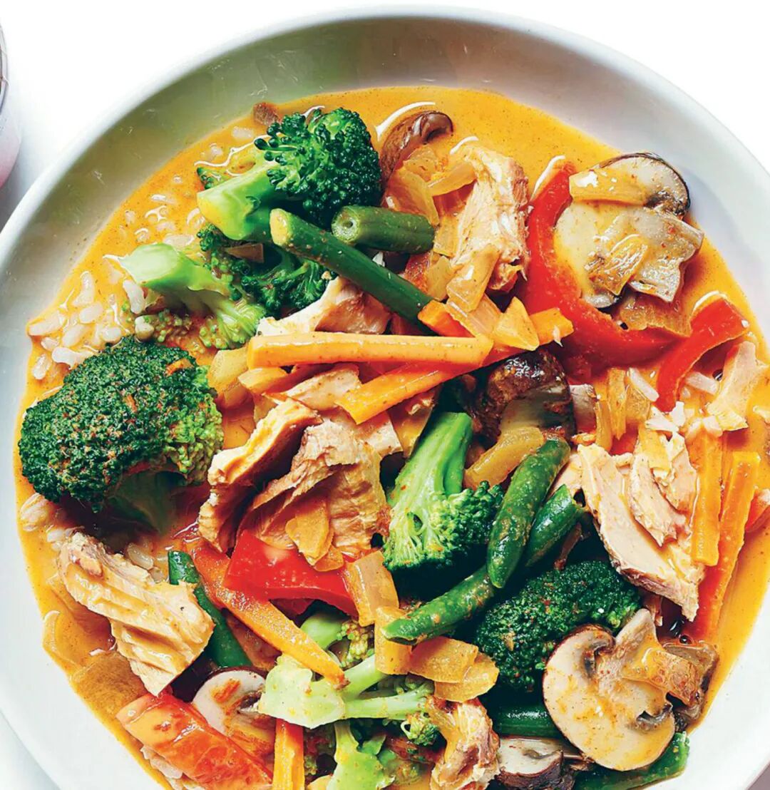 3. 将肉汤和椰奶倒入锅中,用文火炖10 分钟。拌入三文鱼和蔬菜,慢火煮5分钟。拌入柠檬汁和煮好的糙米便可享用。