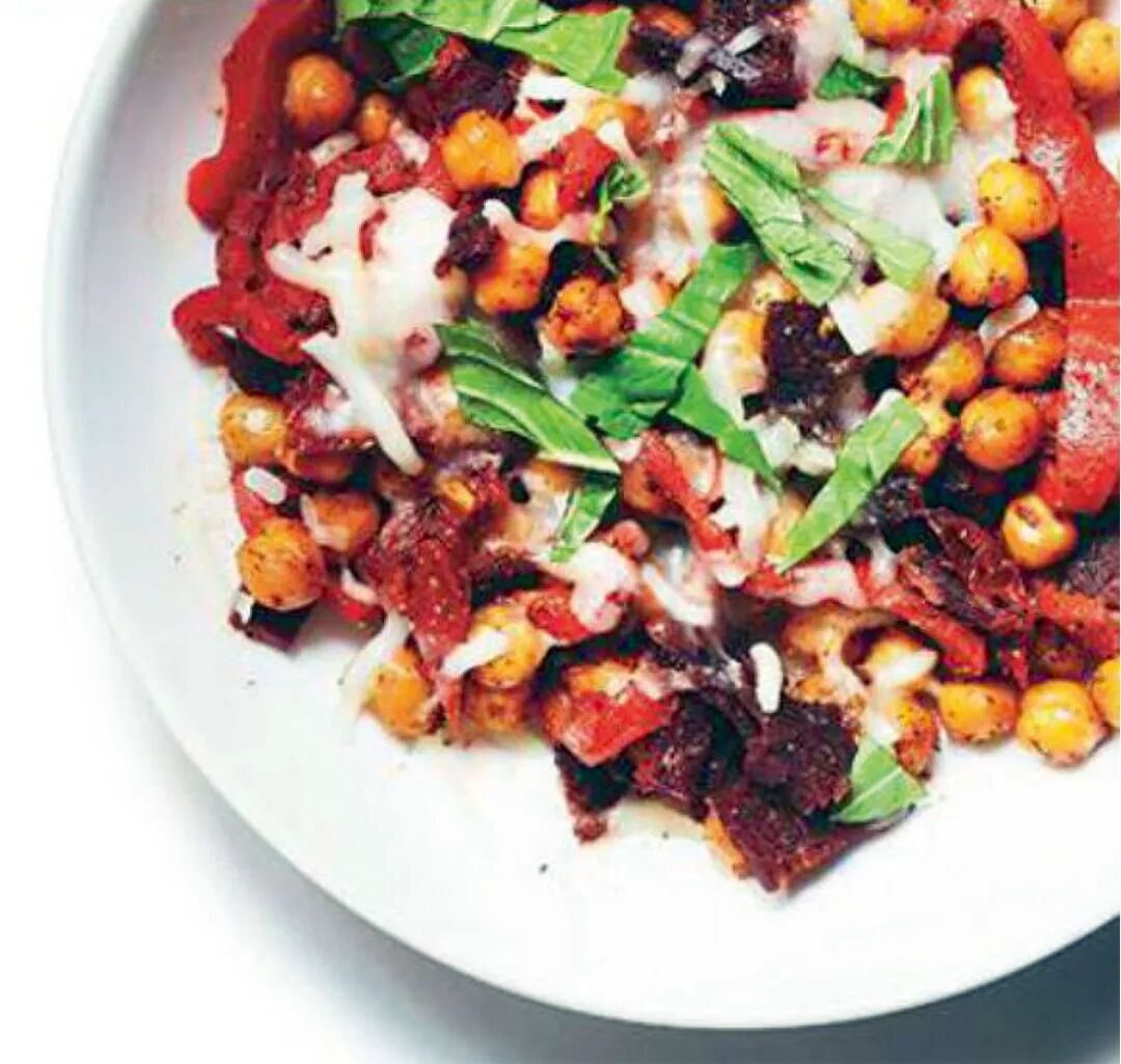 2. 将牛肉干、辣椒、西红柿和番茄酱拌入鹰嘴豆。在上面加上奶酪,烤5 分钟。在各碗中分装,用罗勒装饰好便可享用。