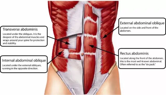 上部核心由胸部肌肉和肩膀前部、背部肌肉和肩背部肌肉组成;中部核心的肌肉是分层的;最深层的核心肌肉由膈肌、腹横肌、腹直肌、腹斜肌、脊柱肌肉和盆底肌肉组成。