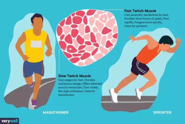 慢肌又称红肌,特点是较纤细、收缩慢、力量小、但耐劳、微血管多、运氧能力强、也能更有效运走废物,适合耐力运动如长跑;而快肌又称白肌,特点是较粗大、收缩快、力量大、但易疲劳、有氧能力弱,适合爆发性运动如短跑、跳高、篮球等等。