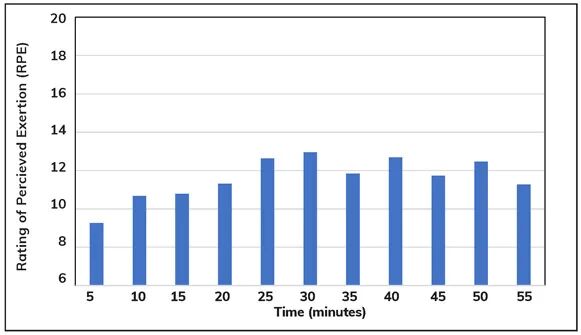 图5显示了整个BODYJAM测试中每个阶段末尾的平均RPE值。整个BODYJAM组的平均RPE为11.1±1.36,其中不包括热身和冷身,这个测试组的平均锻炼时间是11.5±1.91。
