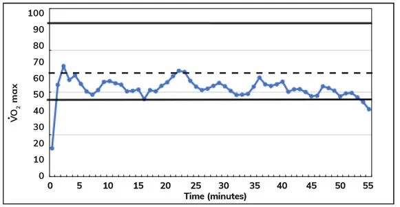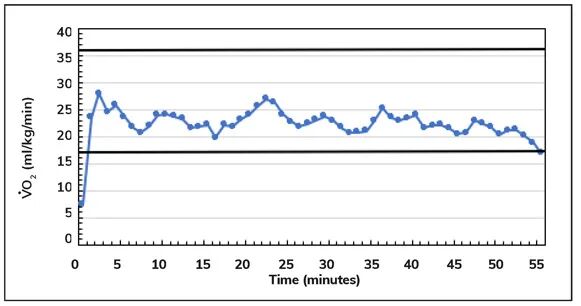 在 BODYJAM 测试期间,预测的平均VO2和%VO2max反应分别如图3和图4所示,预测数据是,VO2为22.3±2.81mL/kg/min,平均%VO2max为52±6.6%。