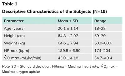 研究小组招募了 19 名年龄在18岁~22岁之间的健康女性。,她们所有人都有有氧舞蹈的经验,而且没有人有心血管或骨科方面的运动限制。在研究开始之前,每个参与者先在跑步机上进行了测试,以确定最大心率(HRmax)和最大摄氧量(VO2max)。