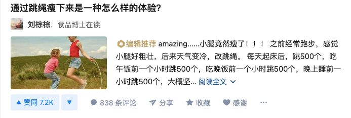 除此之外,跳绳还成为了众多减脂党们心中的「燃脂利器」,知乎上有关「跳绳减脂」的相关问题和文章热度始终居高不下。