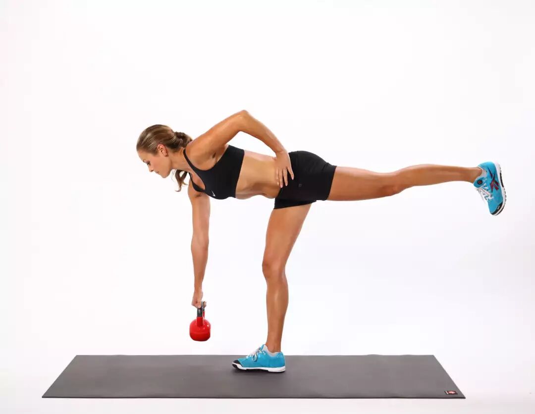 还原时,躯干与右腿迅速还原到初始位置,动作全程保持腰背挺直。