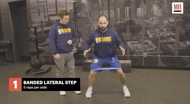 “在膝盖上绑上弹力带,我们会通过侧步来激活臀大肌,然后将进入一个旋转的步骤,保持膝盖固定,不屈曲,然后后退一步,当你把自己的重量均匀地分配时,你会感到臀大肌被点燃了,”Bergstrom说。