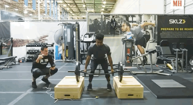 “这个世界一直在做这个错误的事情,高水平的跳跃训练都是有爆发力的,需要高质量的动作。建立一个硬拉的姿势,膝盖超过脚尖,髋部向后,背部保持竖直,从这个位置,他要尽可能地跳得高,然后着地。”