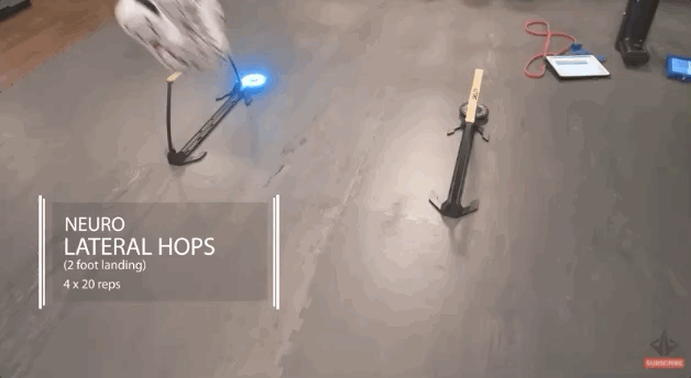 你可以两腿之间夹一个哑铃来做这个训练。我用跳台垫子计算他的垂直度,我没有给他多少次重复,我只是说你去,一旦他下降10%以上,我们就停止这组训练,”Fabritz 说。