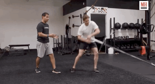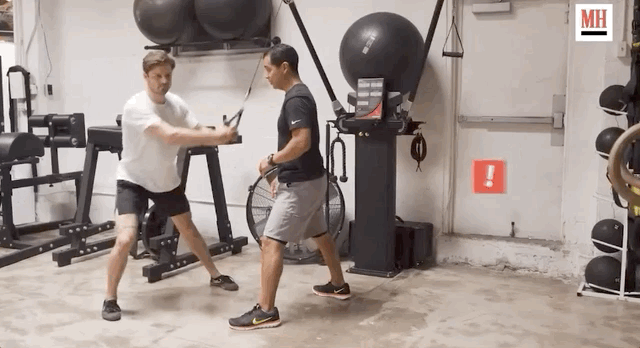 “这是一个很棒的核心练习。脚比肩宽一点,你的重量被转移到背部,大部分的拉动动作都是用另一只手完成的,眼睛向上盯着目标,移动并传递能量,你的大部分体重不应该在你的膝盖或你的脚前,而是大部分转移到臀部。”