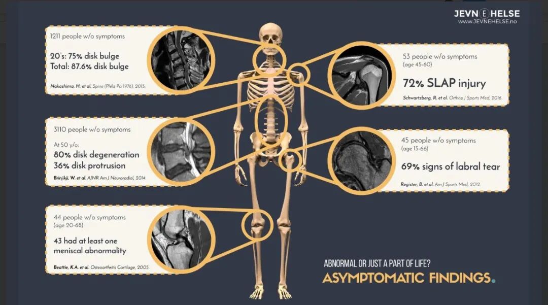 广泛的研究表明,对于一个20岁以上的人,无论你在哪里使用核磁共振,你都很有可能发现明显的损伤,即使是在没有疼痛的地方。关于这一点,下面的这张图进行了很好的总结。