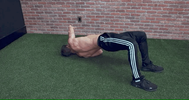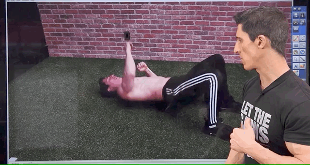 第一个动作是 bridge and reach over,通过脚跟发力进入臀桥式,这样可以打开你的髋部并激活臀大肌;而侧身拉伸也能锻炼肩膀,创造良好的胸椎旋转。