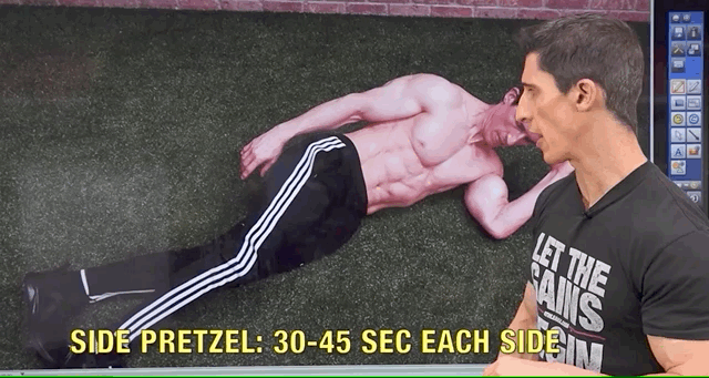 第 3 个拉伸动作是 side pretzel,这是另一个很好的胸部旋转动作,需要抓住另一条腿到你的手臂上。