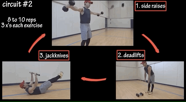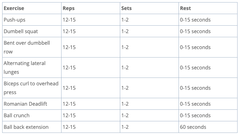 为了在循环训练中获得最大效果,最好进行全身锻炼。下图是一个中级全身力量循环训练计划的例子:
