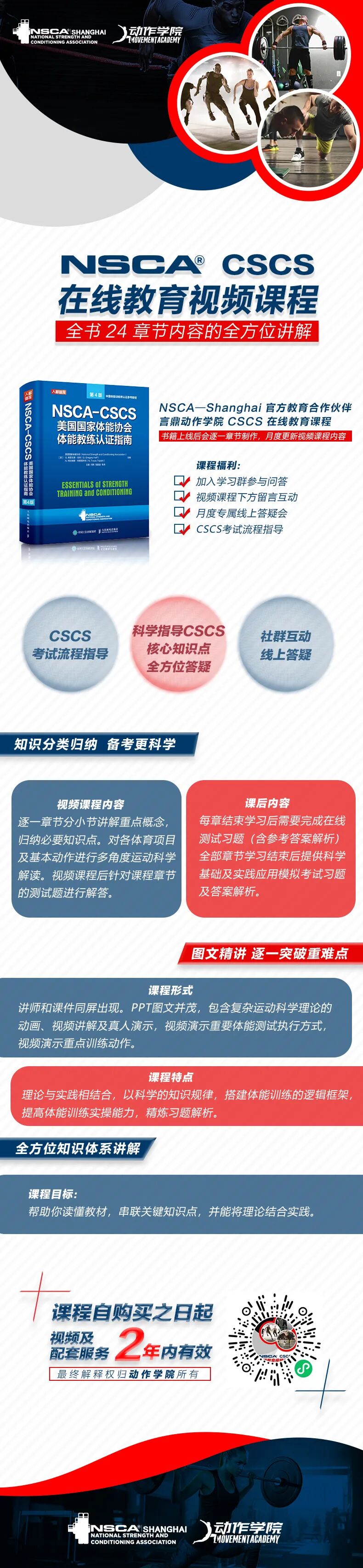 动作学院现已推出NSCA-CSCS在线教育视频课程,希望可以帮助大家更好的了解CSCS,更好的学习CSCS。