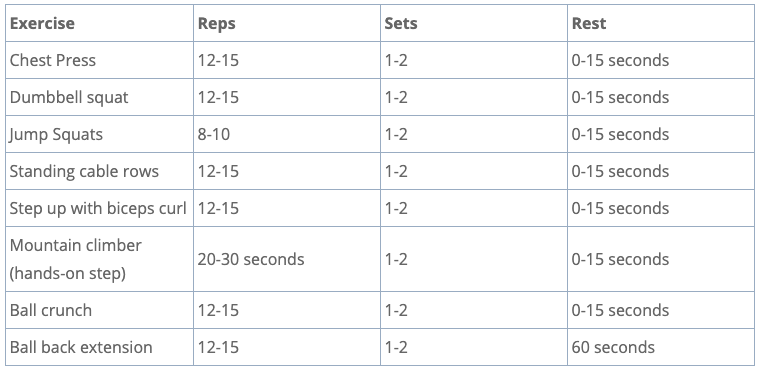 只要把控好练习的顺序和/或练习之间的休息时间,训练会很容易变得更有挑战性或更少的挑战性。初学者可以从上半身和下半身的交替练习开始,一开始可以选择在练习之间休息15-30秒。
